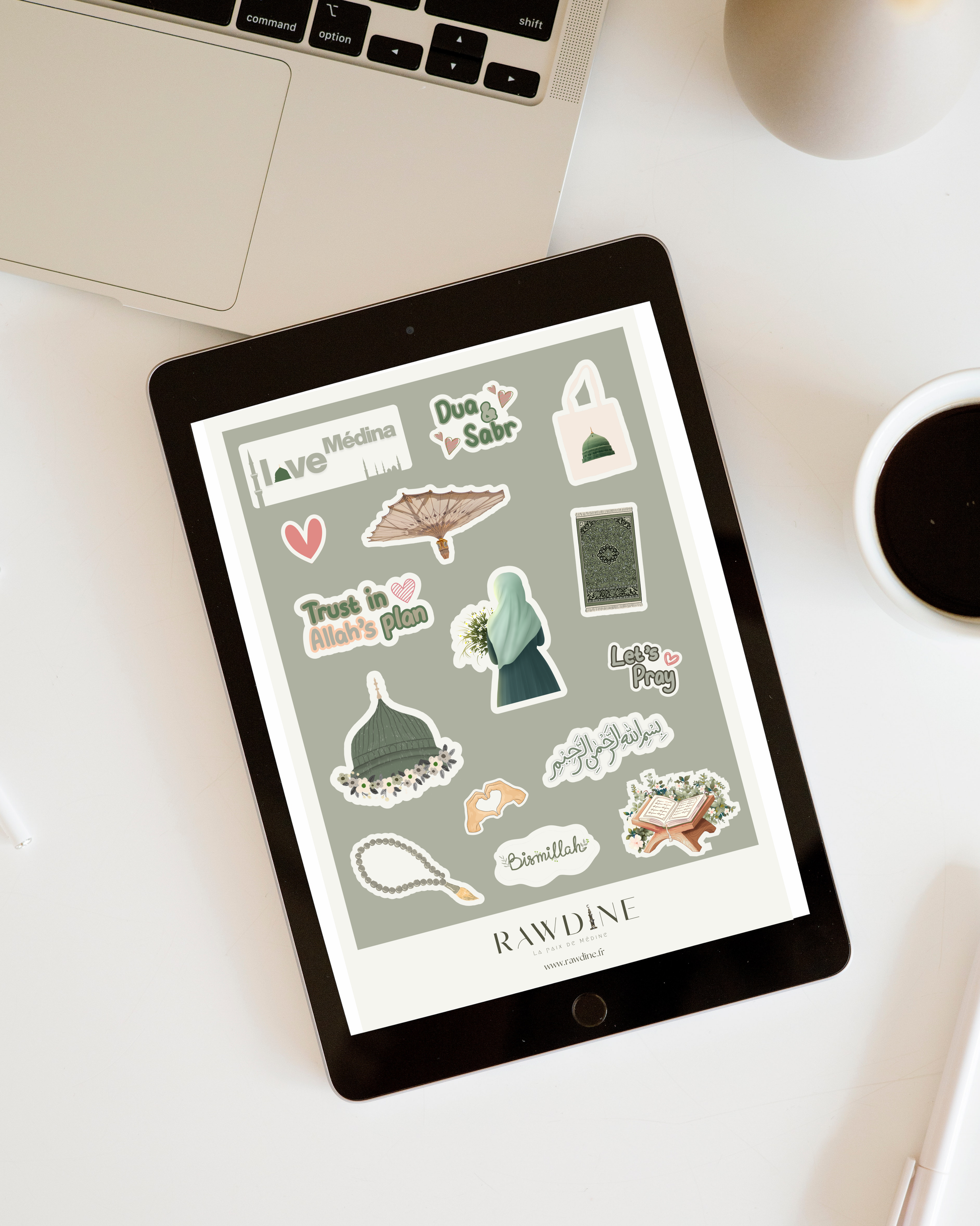 La plaquette Rawdine regroupe 15 stickers, inspirés de l’esprit de Médine : ses symboles, ses couleurs douces et son ambiance paisible. Parfaits pour personnaliser tes objets du quotidien, ces stickers allient esthétisme, qualité et signification.